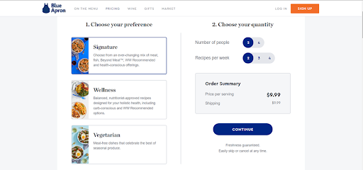 The sign-up and ordering process for Blue Apron is straightforward. First, you choose your meal preference, the number of people being fed (2 or 4), and the number of recipes you want each week. You’ll then add your account and billing information, and confirm your plan and pricing.