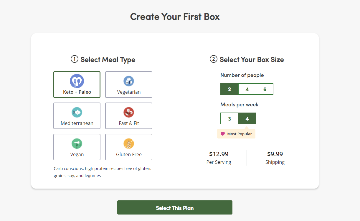 You will first choose one of these when building your delivery plan. Once you choose the category that best meets your needs and preferences, you can choose how many recipes you’d like to receive on a weekly basis.