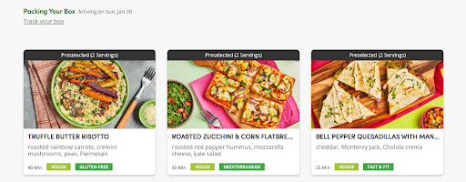 You can pick from three recipes per week to serve two people up to four recipes per week to feed six people. There are around 30 recipes to choose from each week if you don’t have dietary restrictions. If you’re vegetarian, there are 9 recipes to choose from each week that don’t contain meat or fish proteins. Pricing ranges from $13.49 per serving (for dinner for 2, 3 meals a week) to $11.99 per serving (for dinner for 6, 4 meals a week).