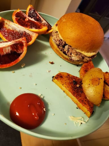 These included a super easy homemade veggie burger patty, made with kidney beans, onions, and breadcrumbs, held together with cornstarch and chia seed vegan “eggs”, and cooked in oil in a skillet. They came with a side of potatoes to roast into seasoned fries.