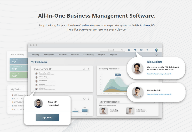 Striven offers a comprehensive suite of tools that includes accounting, customer relationship management (CRM), project management, inventory control, and human resources (HR) in one system.