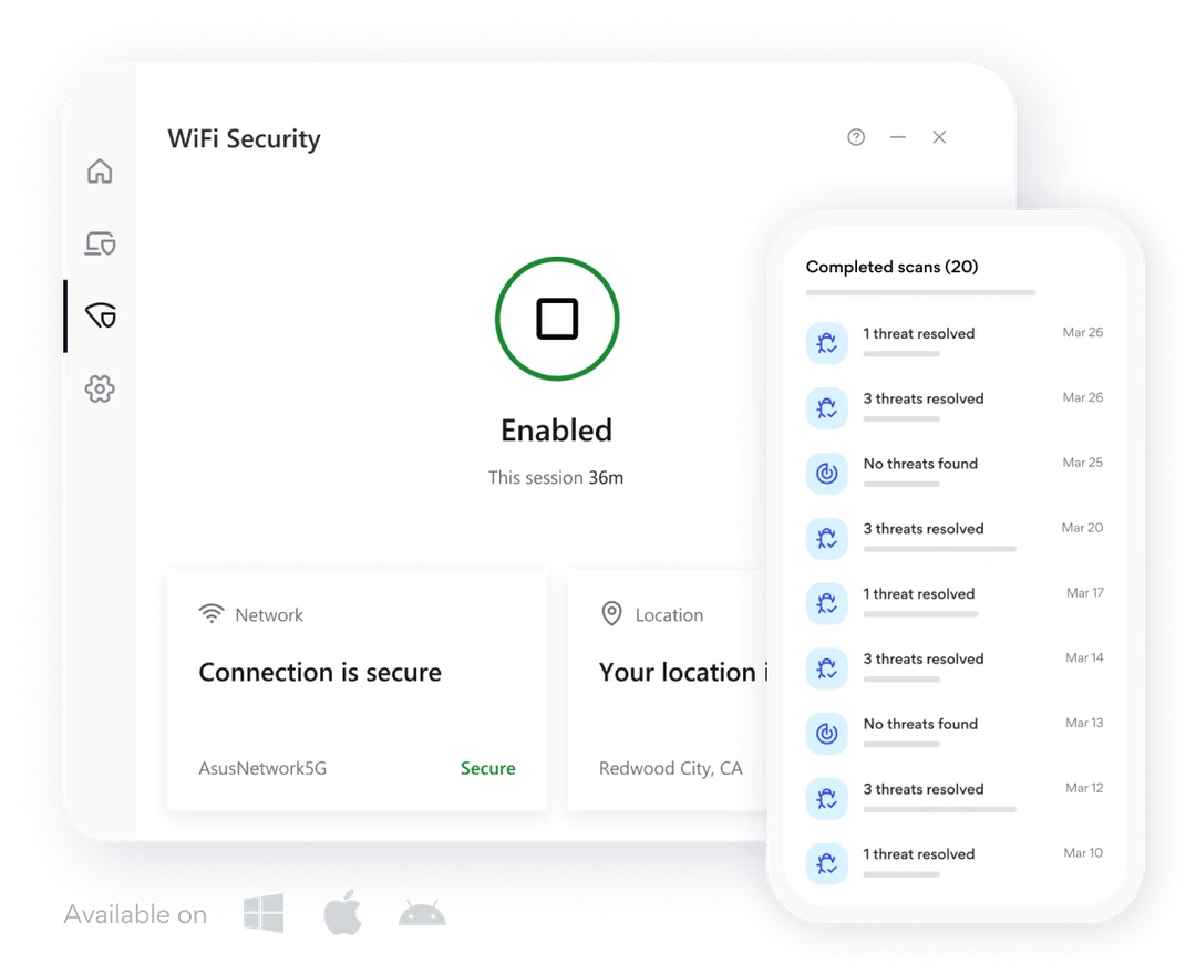Aura’s apps comprise user-friendly dashboards where you can take actions (e.g. do a malware scan, connect to a secure VPN) and see critical data (e.g. threats resolved in recent scans, your connected networks).