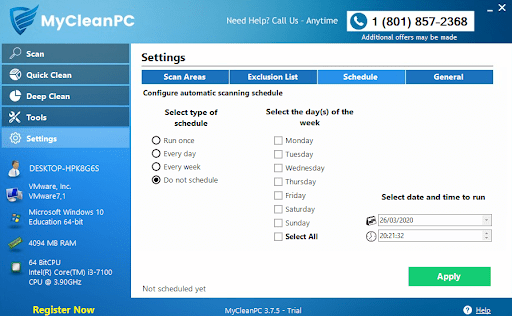 The best way to run a cleanup utility is to have the program run at a fixed and regular interval—such as once per day. MyCleanPC allows users to configure the deep cleaning process to run at either a fixed interval or at a pre-defined time. As the scanning process can cause a minor slowdown to the system, this is a great option for users that leave their computers running and want to run the speedup and optimization utility at a certain time when they are not running other tasks.