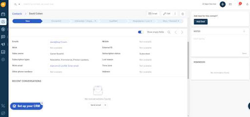 Freshsales allows users to enrich the default contact view with as much information about the lead as can be pulled from the internet, including social media profiles from Facebook, Twitter, and LinkedIn. This provides a more immersive experience for leads by aggregating all the information about them into one page. Given that the CRM also integrates with Freshdesk, and support information can be synced to lead pages, users can have all the information they need in front of them.