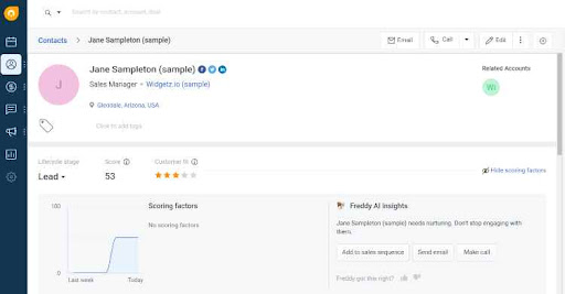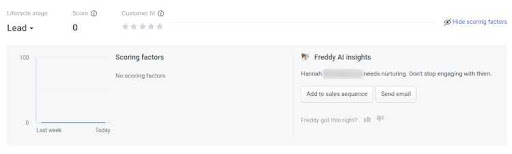 Freddy can also provide insights as to suggested engagement strategies for sales teams. For instance, during our trial of the solution, Freddy prompted us to nurture a lead. The feedback option, provided through a thumbs up/thumbs down survey, would continue to feed data into the AI engine. And so Freddy gets better and better at helping your sales team run their operation.