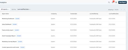 Freshsales comes with a powerful analytics and dashboard generating engine that is capable of generating dashboards and reports based upon CRM data. Some of these are prepopulated; however, users are also free to create their own based upon data in the CRM. For instance, the prepopulated email dashboard provides a birds-eye overview of all outbound email activity including potential KPIs such as emails opened, unsubscribes, and emails bounced. Whether users are happy to rely upon prepopulated templates or want to pull together their own reports, there’s plenty of functionality in the tool for users to play around with.