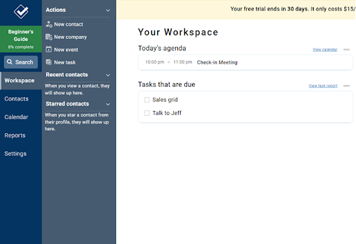 Less Annoying CRM offers one of the best onboarding experiences for new users I’ve seen. First, it’s great to be able to try the service for a month for free without even needing to enter credit card details.