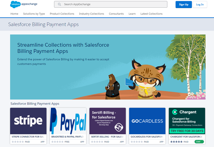 The payment processors available through the Salesforce AppExchange are Sertifi, Braintree, PayPal, Chargent, FinDock, and Stripe. Salesforce also works with payment gateways CyberSource, Payeezy, and AuthorizeDotNet.