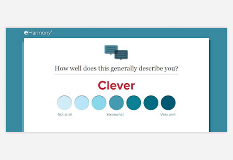 Users are required to complete eharmony’s compatibility test as a first step and are encouraged to do so thoroughly and honestly to increase the accuracy of their matches. With over 400 questions, it is the longest part of the signup process. Some questions take seconds to answer and have preset options, whereas others require a little more thought. These longer answers are designed to unveil layers of your personality by asking to >rank yourself by descriptions or adjectives on a scale. Once this section is complete, the free writing questions are a good opportunity to share more about your interests and passions.