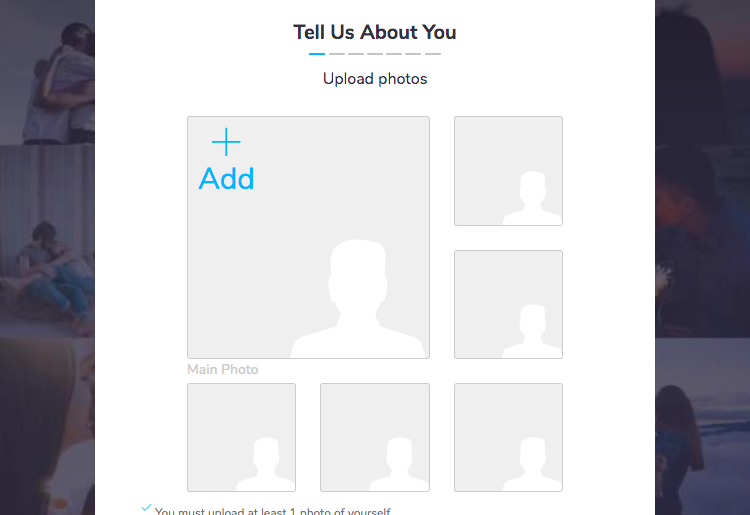 Jdate requires all users to upload at least 1 photo (you can add up to 6), and it advises adding a selection of photos where you can clearly see your face. You can either upload photos directly from your device or add photos you’ve already shared on Facebook.
