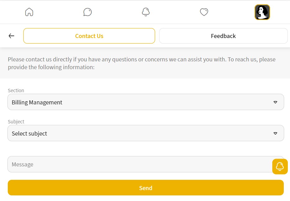 Alternatively, under your profile avatar, you'll find "Get Support" on the drop-down menu. Here, you'll see answers to FAQs such as "How to make a payment." Use the message box to send an email if you can't find the answer you're looking for.