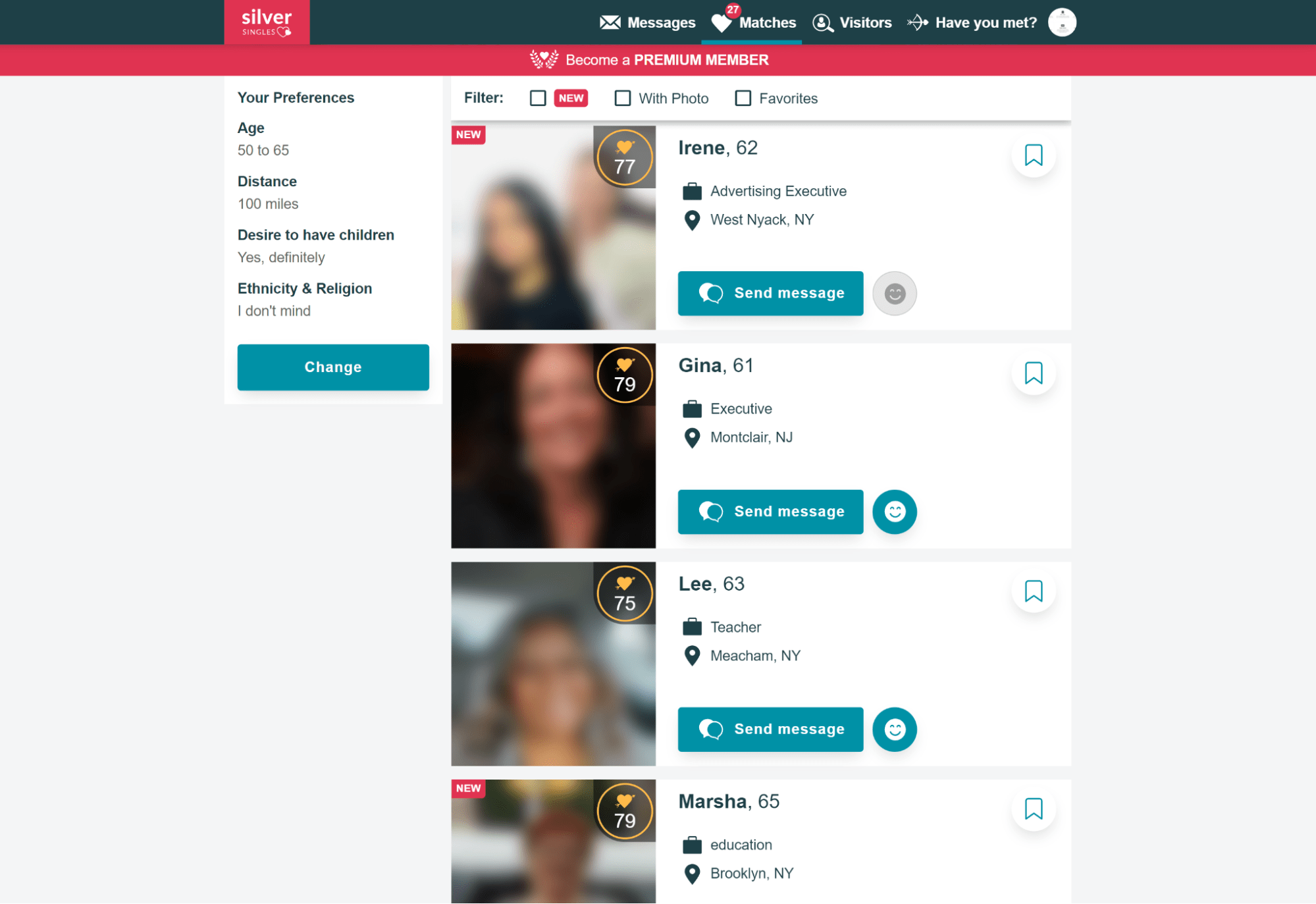 SilverSingles doesn’t allow manual searches in the interest of showing users only highly compatible matches based on shared interests and hobbies. Instead, each day, you will receive 3-7 matches that suit your personality, desires, and location parameters.