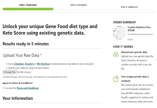 Then visit Gene Food’s website and click Upload Raw DNA Data. You can upload your DNA file and then proceed through the checkout process to purchase Gene Food’s analysis. The only personal information required is your name, phone number, and email.