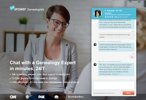 One of the best things about JustAnswer is that you can ask questions and have them answered at any time of the day or night. Genealogical experts are available 24/7, enabling you to get an answer as fast as possible.