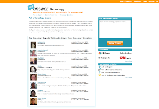 Legacy Tree Genealogists offers a number of packages that involve an expert performing genealogical research on your behalf. It’s expensive, with prices starting in the thousands, but it’s a good option if you have the money to spend. JustAnswer is a much simpler platform, enabling you to ask genealogical experts short questions.