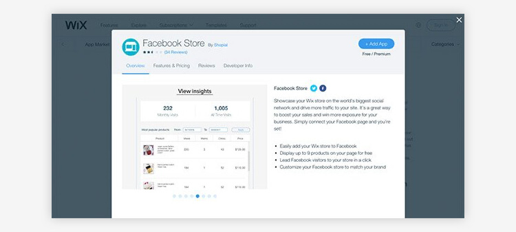 Both of the plans are for running an Ecommerce site on Wix, so if you want to sync that online store to a Facebook store, you need to purchase the Facebook store app, which costs $6.99/month. The app—developed by 3rd party company Shopial—is available for free, but the free version only allows you to display up to 9 items.
