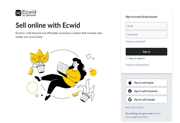 Getting started with Ecwid is straightforward, and I was able to finish the process in a few minutes. You can sign up for Ecwid on desktop, providing your email address, full name, and password, or by clicking the Sign Up with Google/Apple/Facebook buttons. Alternatively, you can sign up via the iOS or Android apps.