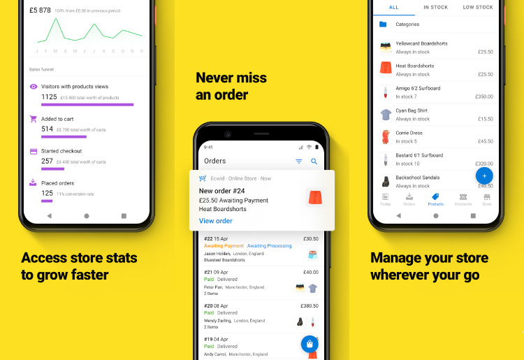 The Ecwid app enables you to manage orders, design, and launch an eCommerce business through your mobile device, sell directly on your website, make in-app purchases, and update your inventory. You can also market your business, speak to customer support, and subscribe to the Ecwid pricing plans.