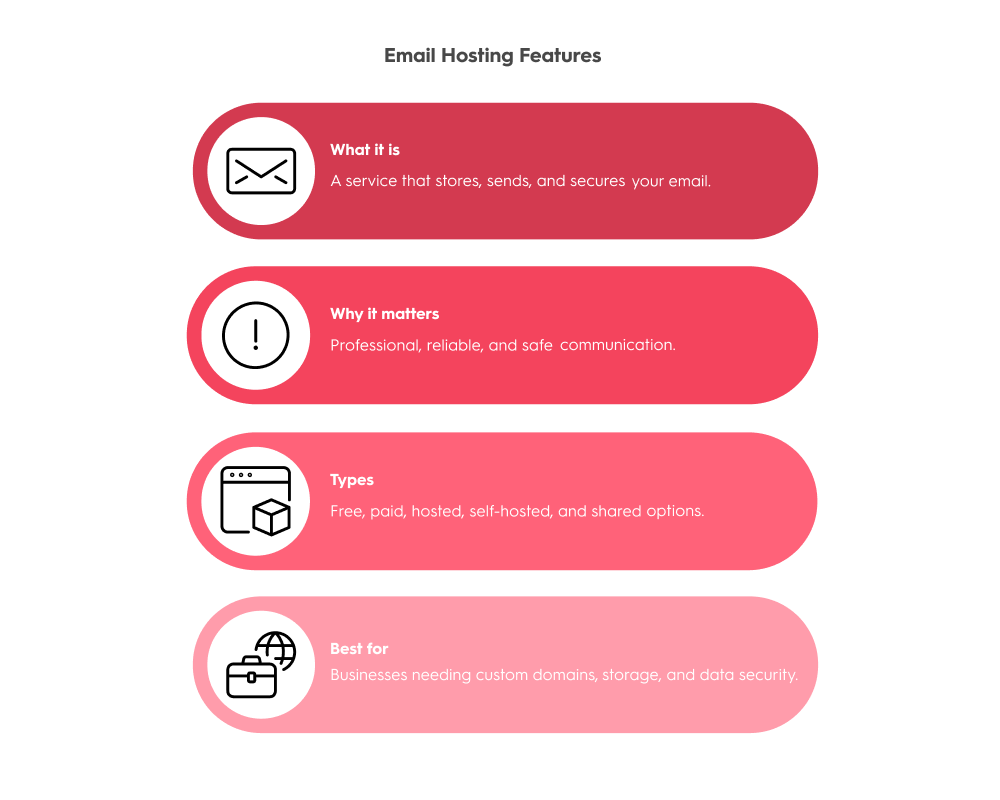 Email hosting can be as simple as creating a free business email account with basic storage, or as advanced as managing a scalable, encrypted, custom-domain system that supports thousands of users. The type of service you choose impacts reliability, professional image, and how well your communication systems can grow with your needs.