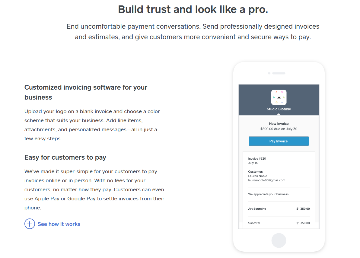 Square is another great invoice management tool for small business owners. Its features include: