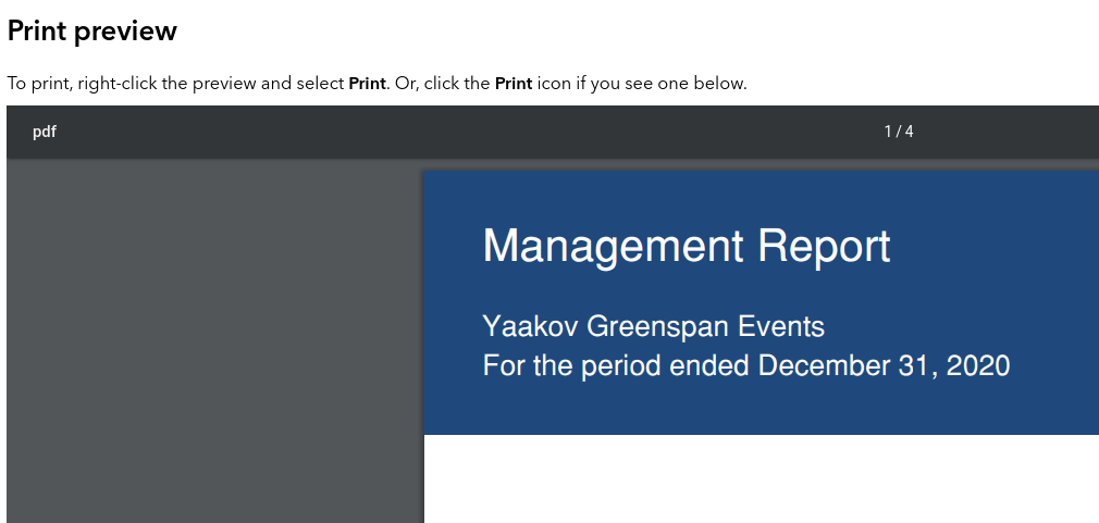In order to generate reports for the first time, users simply click on the ‘Run Report’ button. After that, users are able to download the reports in PDF or spreadsheet format. They can also call up a PDF preview window to show what the finished report document will look like: