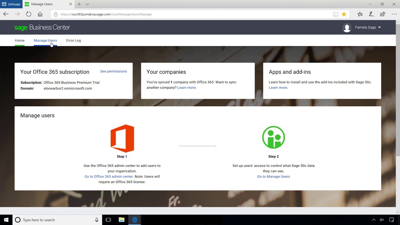 Additionally, user-access information for Sage can also be configured directly within the online Office 365 environment. This is a great advantage for organizations that have resources split between the cloud and local computing environments.