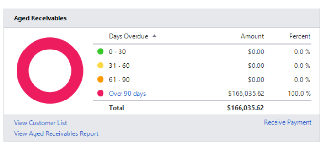 Aged receivables with a pie chart breakdown with days since invoices overdue