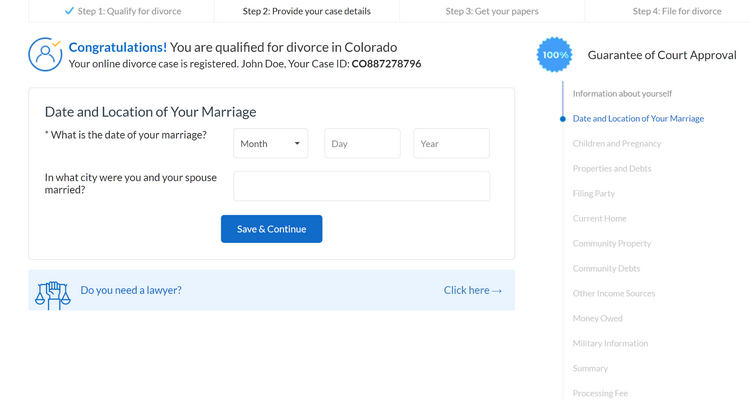 If you qualify to use OnlineDivorce.com, you’ll be taken to a questionnaire. This asks for details about you and your spouse, your marriage, any children you have together, and the assets that will be split up as part of the divorce. You can complete this questionnaire at your own pace and your spouse can create an OnlineDivorce.com account to review the answers remotely.