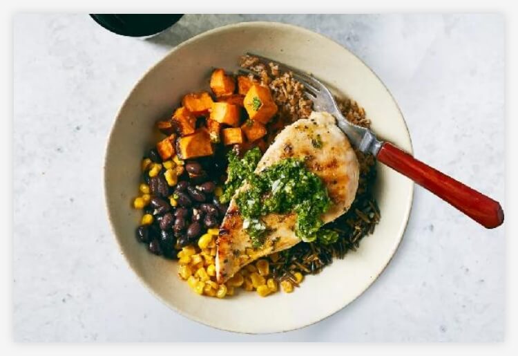 This protein bowl has everything. The juicy chicken sits on a bed of quinoa, wild rice, lentils and buckwheat, complimented by fire-roasted corn, chipotle sweet potatoes and black beans. But it’s the cilantro-lime dressing that pulls it all together—we recommend mixing it up for a southwestern flavor punch. And of course the best bit is, you don’t even have to look at a recipe.