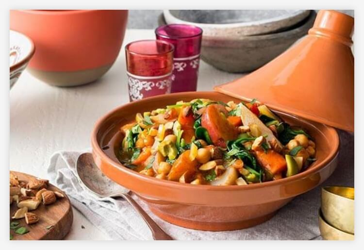 Moroccan Root Vegetable and Chickpea Tagine with Roasted Almonds and Golden Raisins