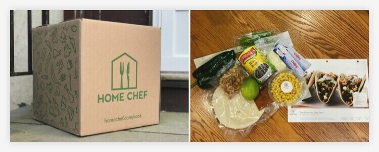 My Home Chef meal kit was waiting on my front steps on the morning of the delivery date, with everything packed neatly into a cardboard box. Inside the box were plastic bags containing the ingredients for each meal. The bottom of the box had a cardboard separator for protein, though none of my ingredients were stored down there.