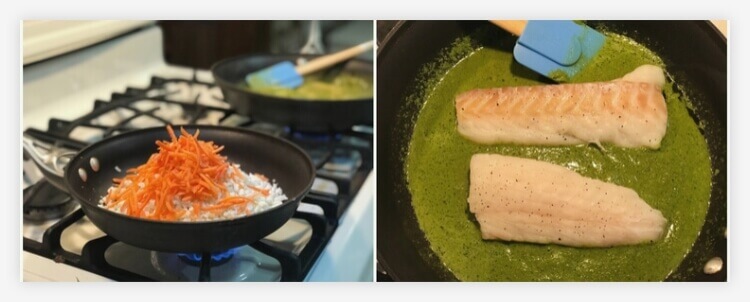 I added 2 tablespoons of oil to a pan, mixed in the curry paste and added half a cup of water. Once the sauce reached a boil I turned down the fire and added the fish. In the meantime I added oil to a second pan, threw in the cauliflower rice and carrots, stirred and set a timer for 5 minutes.