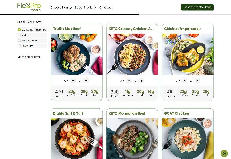 While there are no diet-specific meal plans, FlexPro offers different categories to browse and select from: customer favorites, keto, high protein, and low carb.