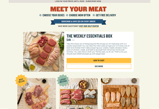 Good Ranchers offers 14 subscriptions and three gift boxes, thoughtfully designed with portion sizes and delivery frequency in mind. Based on your selected box, you can opt for a one-time delivery or regular shipments ranging from weekly to every eight weeks.