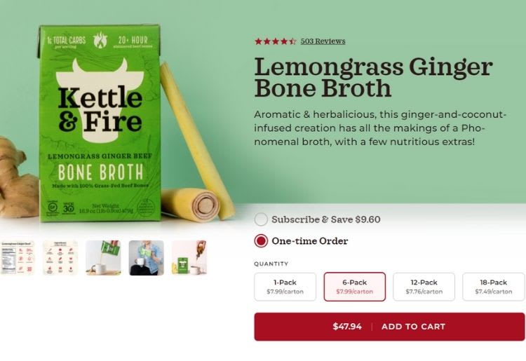 If you build your meal kit in the Kettle & Fire online store, you can opt to enroll in “Subscribe & Save” to save 20% off the price of each carton of soup or broth. This may be more cost-effective than the meal kits if you want to eat some of the soups for quick meals throughout the month and keep a just-in-case stash of non-perishable meals on hand.