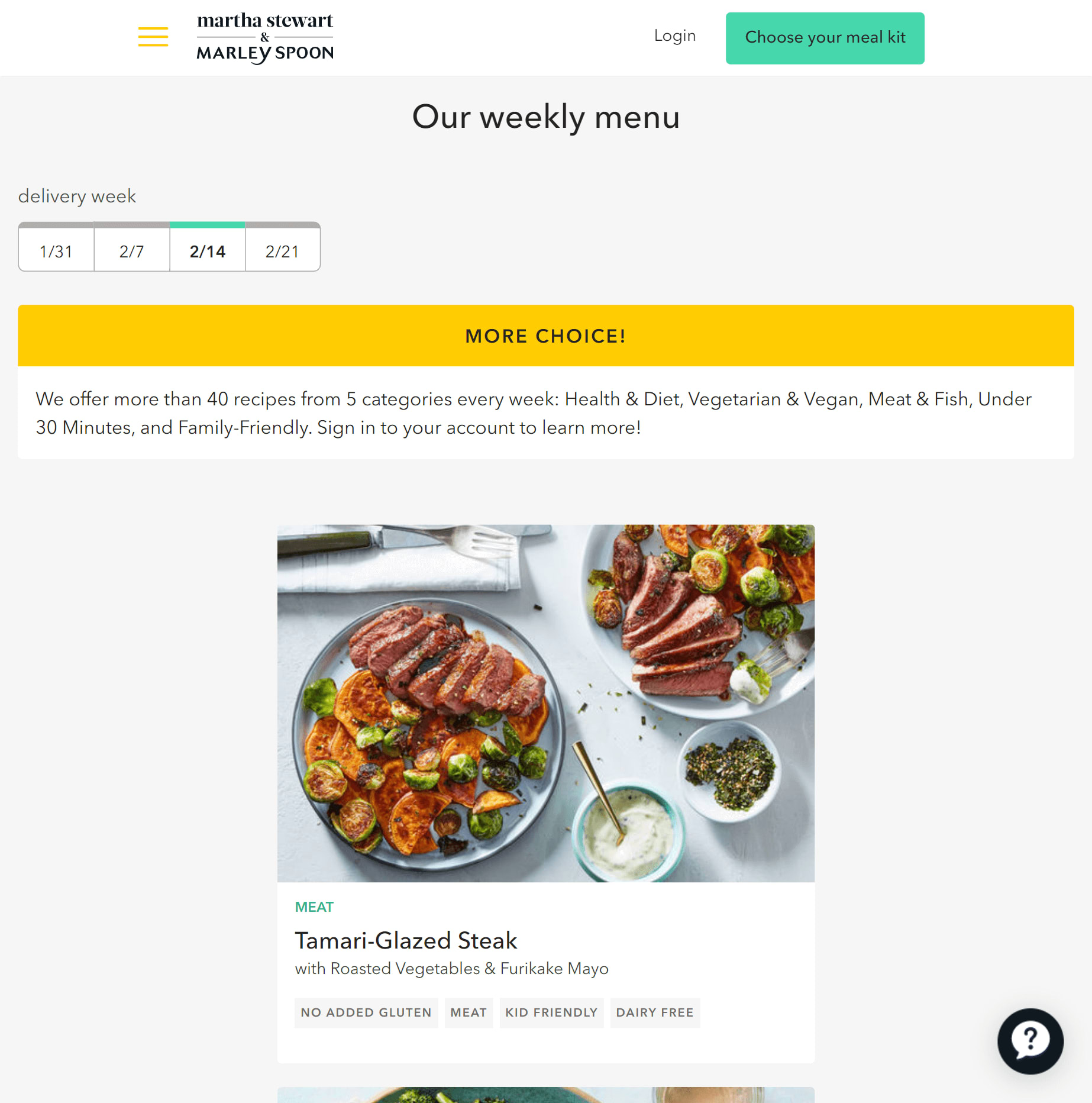 If you’re a fan of Martha Stewart’s cooking, Martha & Marley Spoon will make you feel like a kid in a candy store. Straight from her cookbooks, you get to choose from more than 40 colorful signature recipes each week. Meals are divided into 5 different menus: Health & Diet, Vegetarian & Vegan, Meat & Fish, Under 30 Minutes, and Family-Friendly.