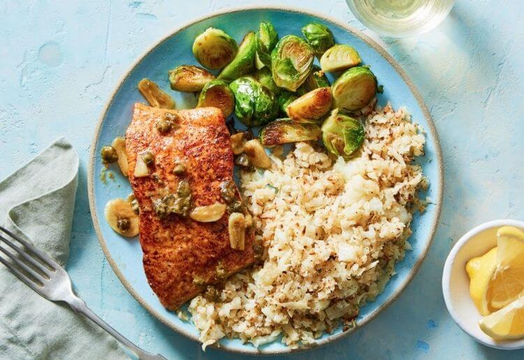 The lemon-brown butter salmon and cauliflower rice is a crowd-pleaser in the Health & Diet category — bonus that it also fits in the sub-30 minute menu. An exemplary of the vegan/vegetarian menu is the vegan braised white beans on ciabatta with rosemary-chili oil and greens.
