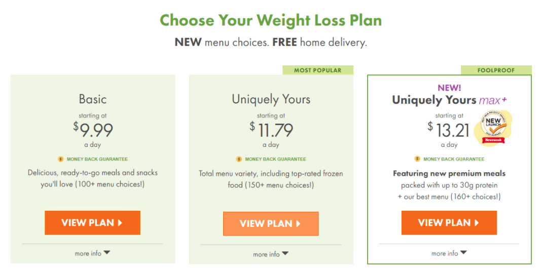 Uniquely Yours: This plan includes over 130 menu choices, ready to eat in minutes. The second-tier plan offers a greater variety of frozen and pantry-ready meals plus free diet shakes. It also comes with full access to dietitians and counselors for weight loss success. This plan starts at $11.79 per day and offers more meal choices, including new “Restaurant Favs” - meals inspired by popular restaurants. This plan also provides food for five days a week.