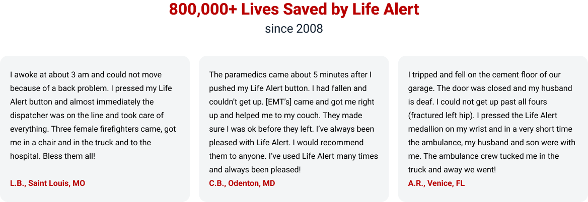 * Life Alert defines a life saved from a catastrophic outcome as an event where a subscriber activated the system, had an actual emergency, was home alone, was unable to get to the phone to call for help, and Life Alert dispatched help. ** When you pay one year in advance. *** Batteries never need charging and last up to 10 years