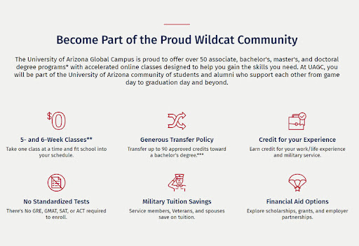 Financial aid is available through scholarships and grants, including grants specifically for military veterans. The University of Arizona Global Campus also partners with major companies like Walgreens, T-Mobile, and Banner Health to offer discounted tuition rates to their employees.