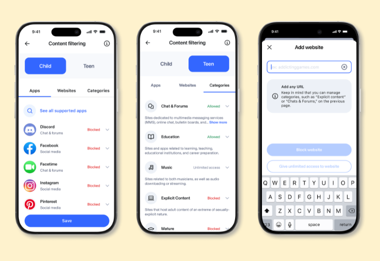 Content filtering and blocking: Set filters based on age (Child, Teen), customize them by category or based on specific words. You can block specific apps, games, and websites entirely, ensuring inappropriate content is stopped before it reaches your child’s screen