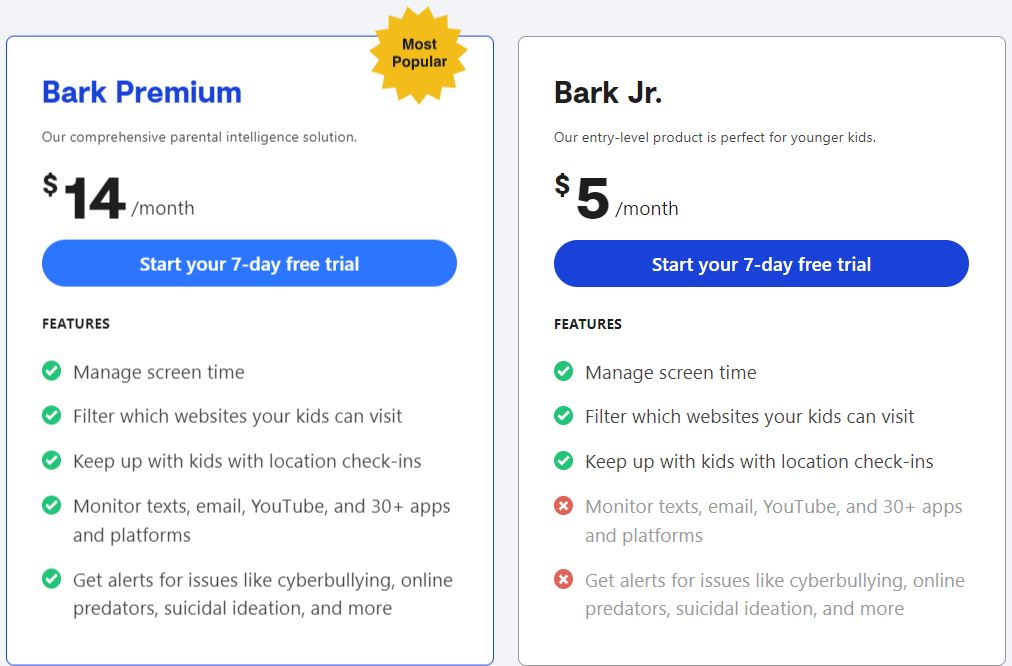 Value: Great; After a 7-day free trial, parents can choose between bark Premium ($14/month or $99/year) or bark Jr ($5/month or $49/year); add an unlimited number of kids and devices under either subscription.