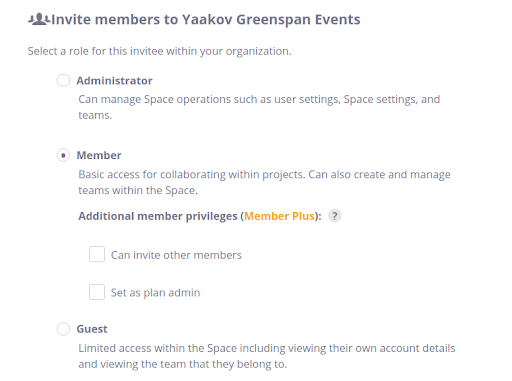 Guests have limited access to the Space and can view their account details and the team they belong to. Members can be regular non-administrative users or be able to act as an admin and invite other members. Finally, users can act as Administrators and configure all settings related to the space—including managing user settings and assigning users to different teams.