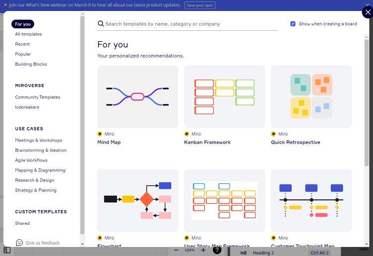 Another thing I really liked about Miro was its huge template library. Here, you’ll find 1000+ pre-designed templates, including everything from simple mind maps and Kanban frameworks to meeting templates and event planning guidance.