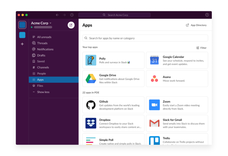 With Slack, you can create unlimited private and public channels to organize your conversations by project, topic, or group. All messages are indexed and searchable for 90 days, and you can also integrate up to 10 apps and services to help streamline your workflow.