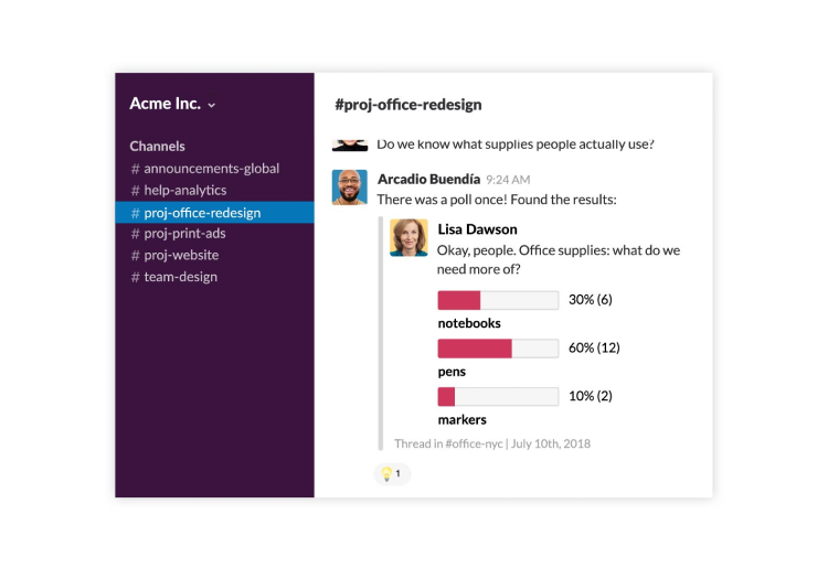 Slack allows you to send messages, share files, and make calls. You can also enhance productivity using @mentions, reactions, threads, polls, workflows, huddles, and a Slack canvas. Slack also supports asynchronous work, allowing you to access the information you need on your own time. This makes it a flexible tool for teams working across different locations and time zones. In fact, the service currently operates in 150+ countries.