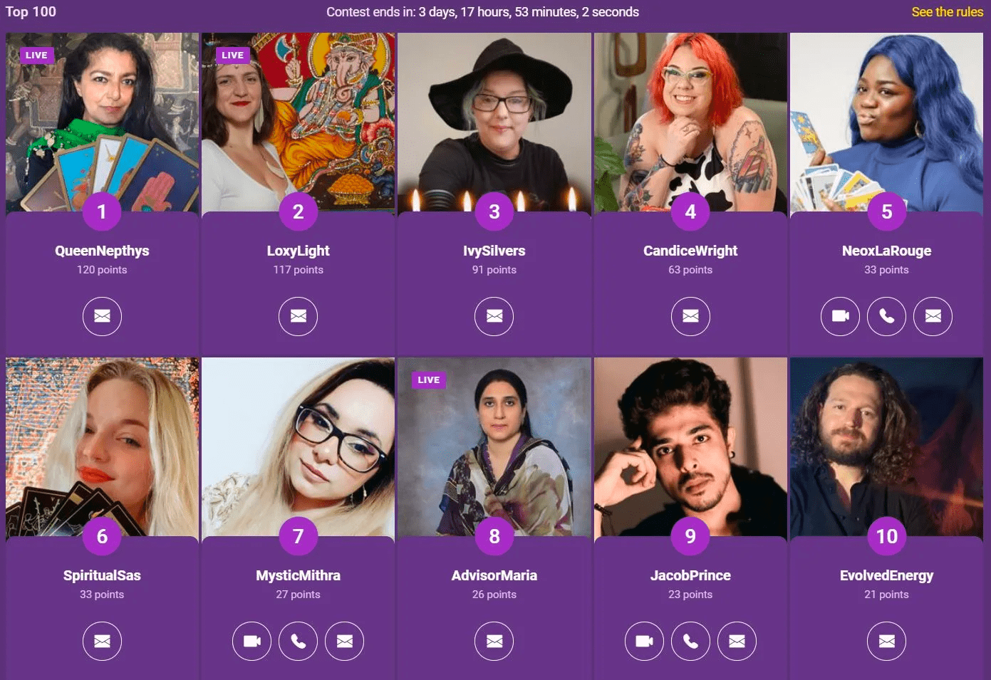 Top 100 ranking system for the psychics so you can see which readers are most popular with other users