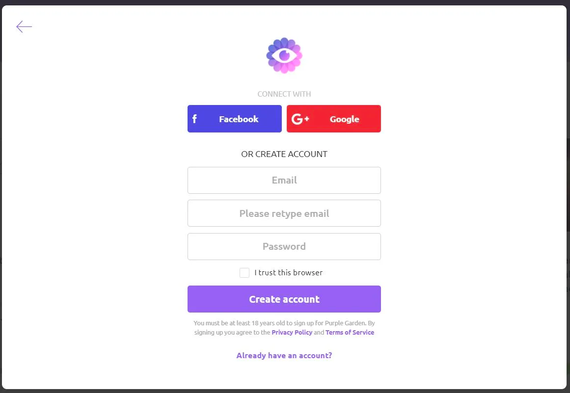 For the app, an account must be created to even browse the psychics and log in to Purple Garden. You can choose to create an account using Apple, Facebook, Google, or an email address. To use Apple, Facebook, or Google, you will have to agree to Purple Garden’s Terms and Conditions, including tracking done by the site. To sign up with email, you will have to create a new password.