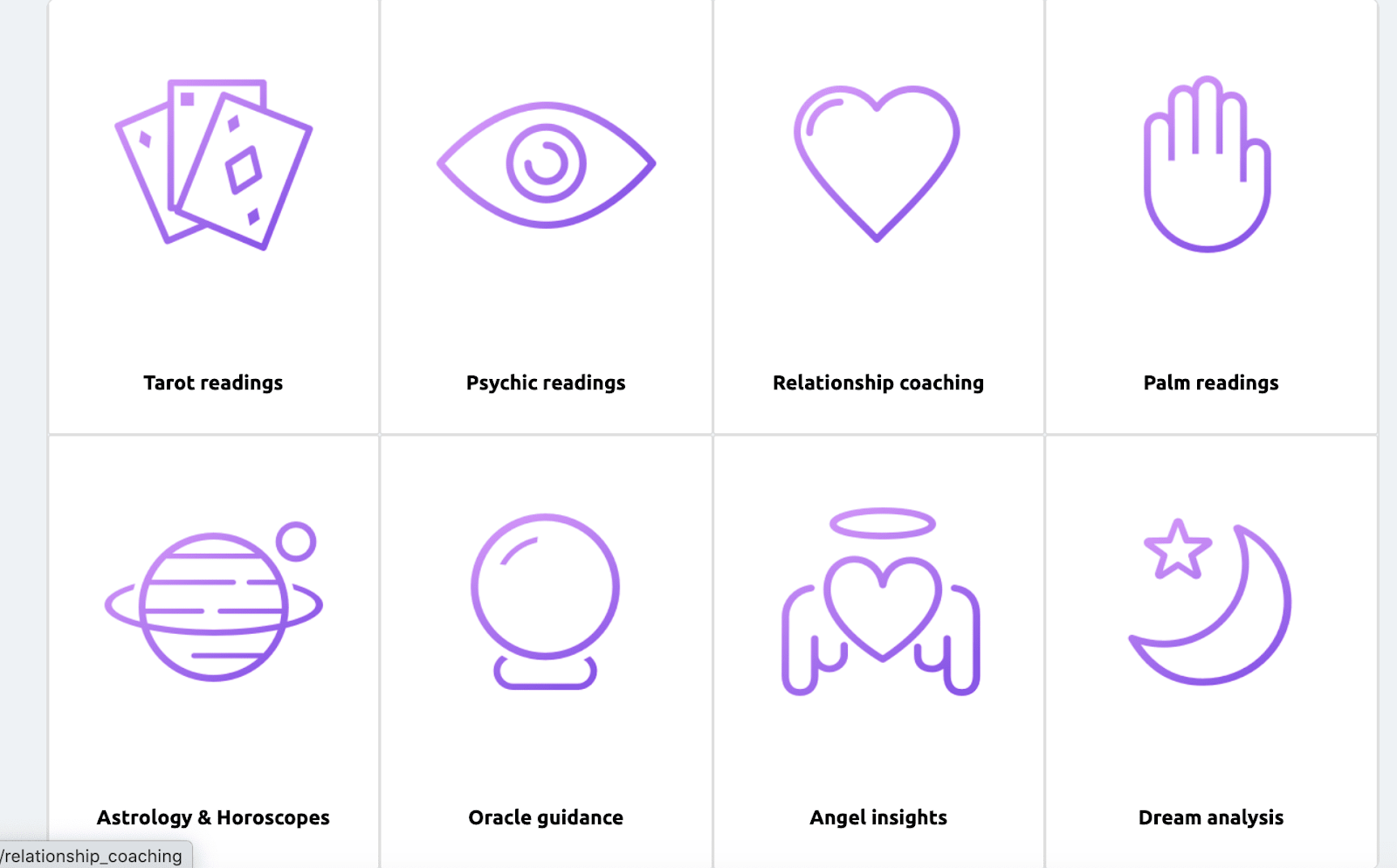 The main reading categories are Purple Garden psychic readings, tarot readings, relationship coaching, palm reading, astrology and horoscopes, oracle guidance, angel insights, and dream analysis. There are also plenty of subcategories that readers specialize in within these categories such as spiritual advising, career advice, relationship advice, pendulum reading, twin flame readings, chakra cleansing, life coaching, mediumship, clairvoyance, clairsentient, and energy healing.
