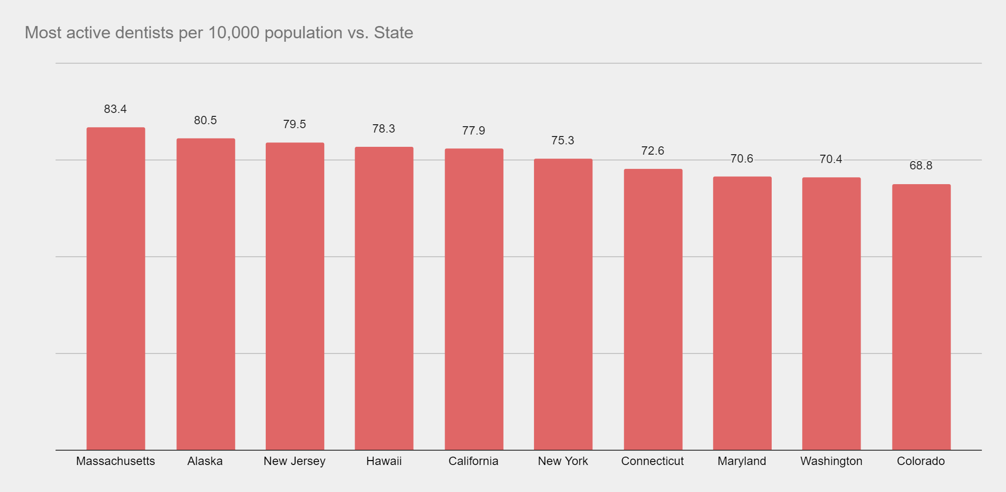According to one survey, Arkansas, Louisiana, West Virginia, and Mississippi fall within the bottom ten states for dentists per capita. Arkansas, for example, has just 41.82 dentists for every 100,000 people and is the second lowest-ranked state in the country, only above Alabama. Throw in the fact that Louisiana and Arkansas are among the bottom five lowest-paying states for dentists, and it’s easy to see why dentists may travel out-of-state for better-paying opportunities.